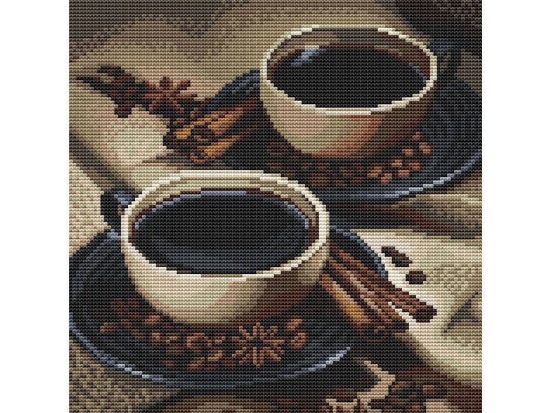 В наборе "Кофейный аромат" из мозаичных элементов на холсте можно выложить накрытый стол на двоих с двумя чашками свежеприготовленного кофе.