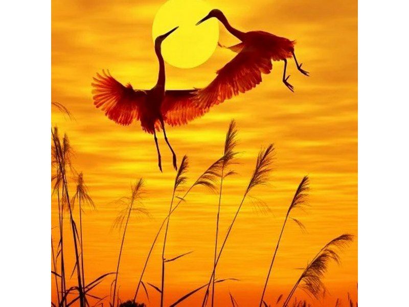 В наборе "Танец журавлей" из мозаичных элементов на холсте можно выложить картину с изображением двух танцующих журавлей на фоне огненного неба и яркого диска солнца.