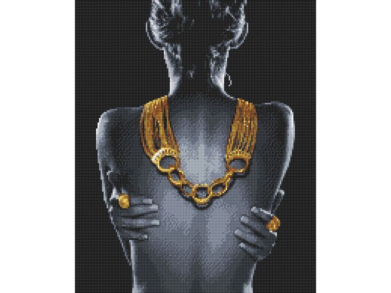 Монохромную алмазную мозаику в оттенках темно-серого и черного цветов с расставленными акцентами золотого цвета можно своими руками выложить на холсте с клеевой основой. Эффектная мозаичная картина украсит интерьер и сможет стать прекрасным подарком.
