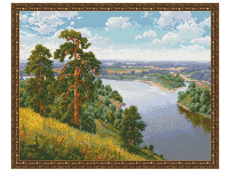 С помощью мозаичных элементов на холсте можно выложить картину русского художника Игоря Прищепы "Обрыв" - ясный день, берег реки и необъятные просторы.