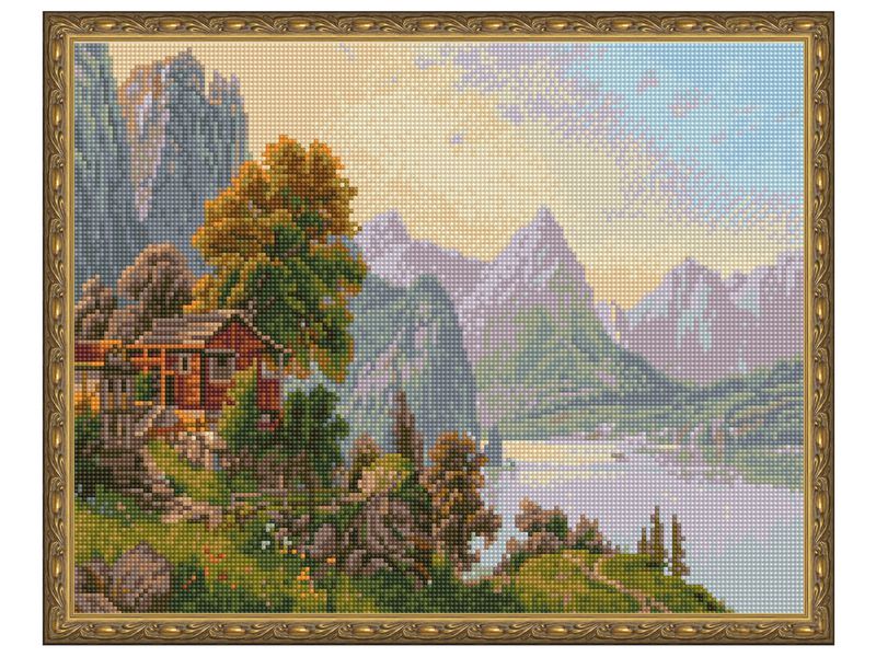 С помощью мозаичных элементов на холсте можно выложить картину русского художника Игоря Прищепы "Уютный уголок" с домом на берегу реки в окружении гор.