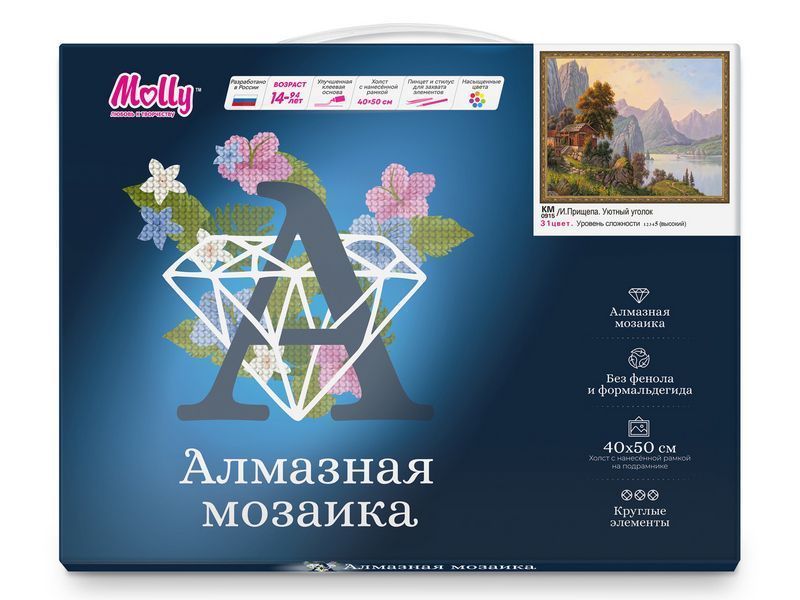 Алмазная мозаика - наборы, в которых желаемое изображение выкладывается на основе со схемой рисунка при помощи специальных декоративных элементов. Подсказка в виде нанесенного контура существенно облегчает задачу и дает возможность создавать картину даже людям, не имеющим художественных навыков. Готовая картина переливается на свету всеми цветами радуги. К тому же, принцип рисования по номерам, заложенный в основу создания алмазной мозаики, делает такое творчество доступным каждому и исключает неудачи.