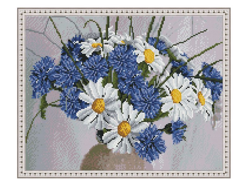 С помощью мозаичных элементов на холсте можно выложить нежный, летний букет из васильков и ромашек в ваз.