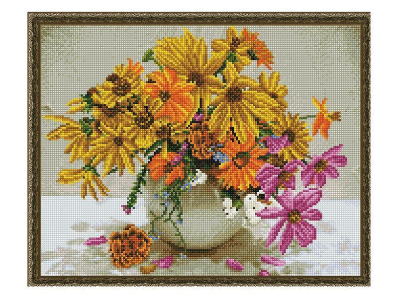 С помощью мозаичных элементов на холсте можно выложить картину с изображением букета розовых, желтых и оранжевых цветов в белой вазе.