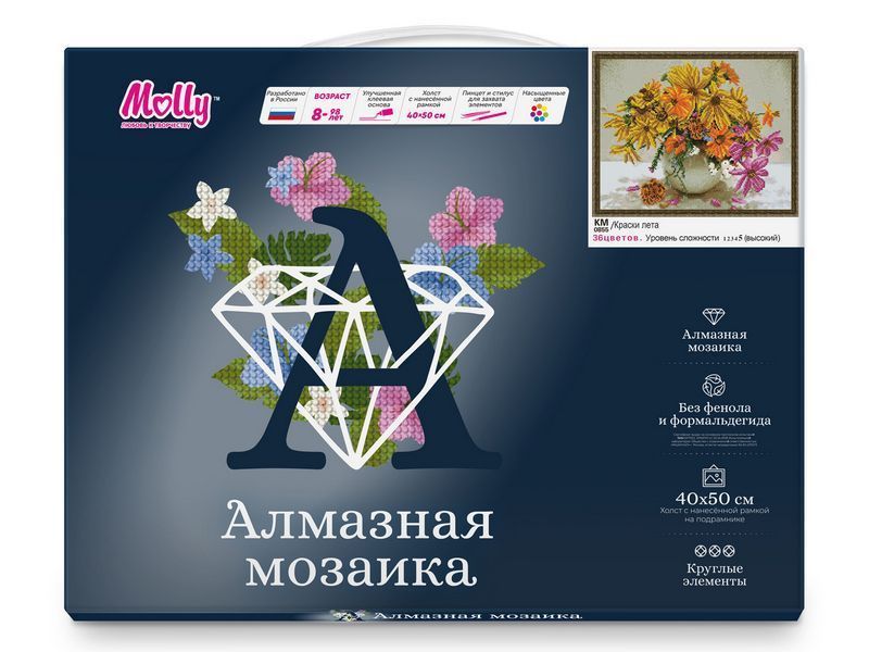 Алмазная мозаика - наборы, в которых желаемое изображение выкладывается на основе со схемой рисунка при помощи специальных декоративных элементов. Подсказка в виде нанесенного контура существенно облегчает задачу и дает возможность создавать картину даже людям, не имеющим художественных навыков. Готовая картина переливается на свету всеми цветами радуги. К тому же, принцип рисования по номерам, заложенный в основу создания алмазной мозаики, делает такое творчество доступным каждому и исключает неудачи.