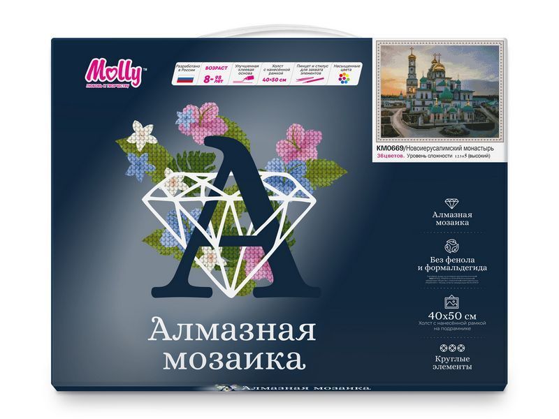 С помощью мозаичных элементов на холсте можно выложить картину с изображением Воскресенского Новоиерусалимского монастыря.