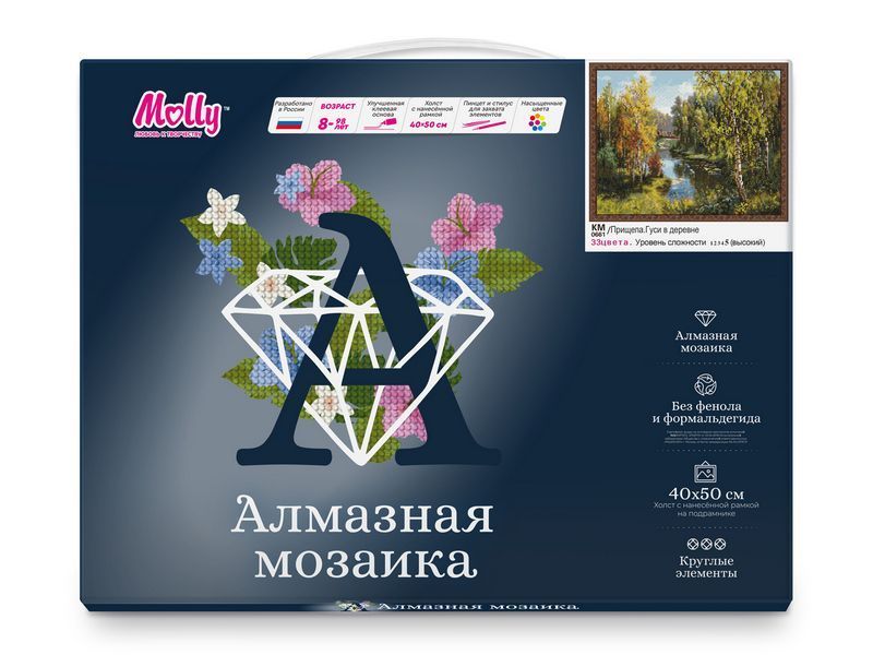 Алмазная мозаика - наборы, в которых желаемое изображение выкладывается на основе со схемой рисунка при помощи специальных декоративных элементов. Подсказка в виде нанесенного контура существенно облегчает задачу и дает возможность создавать картину даже людям, не имеющим художественных навыков. Готовая картина переливается на свету всеми цветами радуги. К тому же, принцип рисования по номерам, заложенный в основу создания алмазной мозаики, делает такое творчество доступным каждому и исключает неудачи.