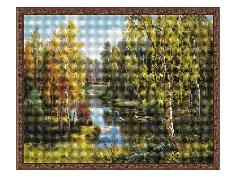 С помощью мозаичных элементов на холсте можно выложить картину Игоря Прищепы "Гуси в деревне". На картине изображен сельский пейзаж. По реке плывут гуси, деревья вдоль берега уже раскрасила в яркие цвета осень. На заднем фоне виднеется сельский дом.