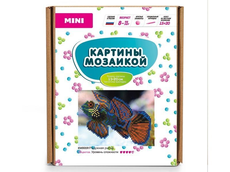 В наборе "Радужная рыбка" из мозаичных элементов можно выложить изображение радужной рыбки. Сине-зеленый отлив окраса рыбки меняется в зависимости от освещения. Фон уже нанесен на холст.