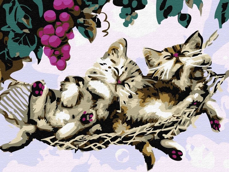 Используя кисти и краски, на холсте можно нарисовать двух маленьких котят, сладко спящих под гроздьями винограда. Для такого творчества не требуются специальные художественные навыки. Нужно лишь следовать инструкции и время от времени сверяться с цветовой схемой рисунка.