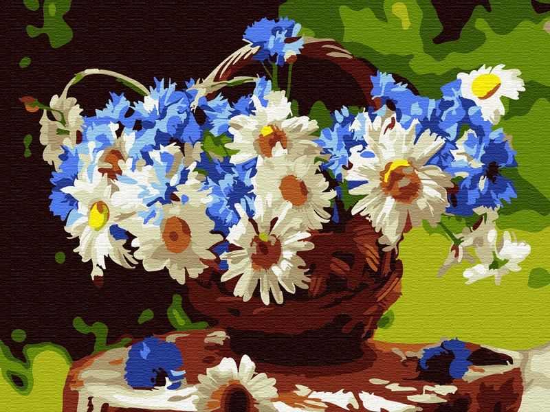 Используя кисти и краски, на холсте можно нарисовать букет нежных ромашек и голубых васильков в плетеной корзине. Для такого творчества не требуются специальные художественные навыки. Нужно лишь следовать инструкции и время от времени сверяться с цветовой схемой рисунка.