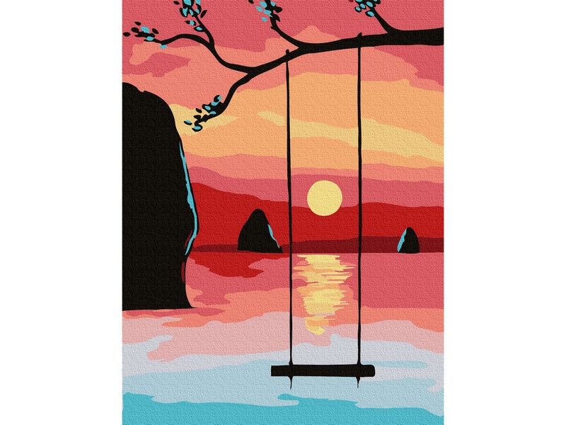 Используя кисти и краски, на холсте можно нарисовать закатное небо и уходящий за горизонт яркий диск солнца. Для такого творчества не требуются специальные художественные навыки. Нужно лишь следовать инструкции и время от времени сверяться с цветовой схемой рисунка.