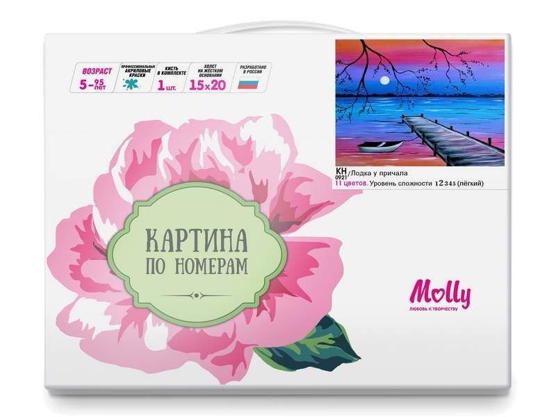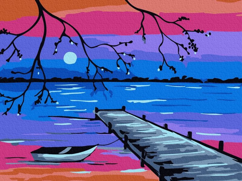 Используя кисти и краски, на холсте можно нарисовать живописный пейзаж: закатное небо, лодку и причал. Для такого творчества не требуются специальные художественные навыки. Нужно лишь следовать инструкции и время от времени сверяться с цветовой схемой рисунка.