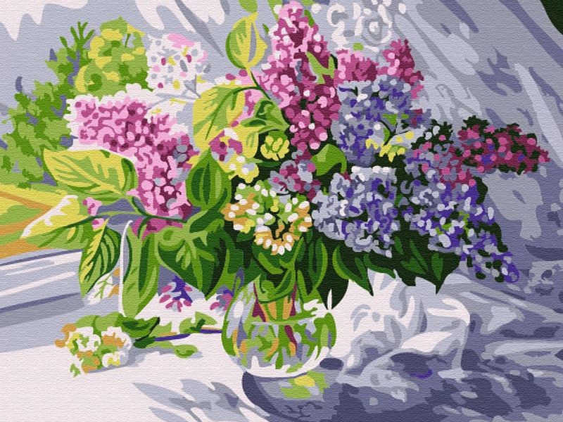 Используя кисти и краски, на холсте можно нарисовать букет разноцветной сирени, стоящий в вазе на окне. Тонкий, изысканный аромат махровой сирени завораживает в разгар весны. Для такого творчества не требуются специальные художественные навыки. Нужно лишь следовать инструкции и время от времени сверяться с цветовой схемой рисунка.