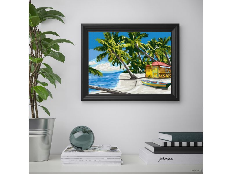 Используя кисти и краски, на холсте можно нарисовать уютный, райский уголок на берегу моря. Для такого творчества не требуются специальные художественные навыки. Нужно лишь следовать инструкции и время от времени сверяться с цветовой схемой рисунка.
