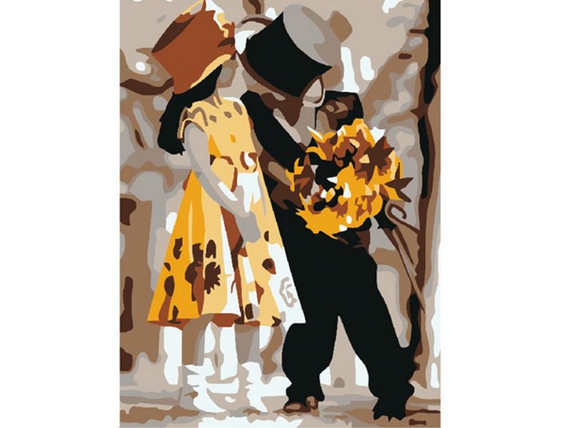 Используя кисти и краски, на холсте можно нарисовать картину "Ухаживание". На картине - юная парочка: леди в милом желтом платье и шляпке и джентльмен в смокинге с бабочкой. Для такого творчества не требуются специальные художественные навыки. Нужно лишь следовать инструкции и время от времени сверяться с цветовой схемой рисунка.
