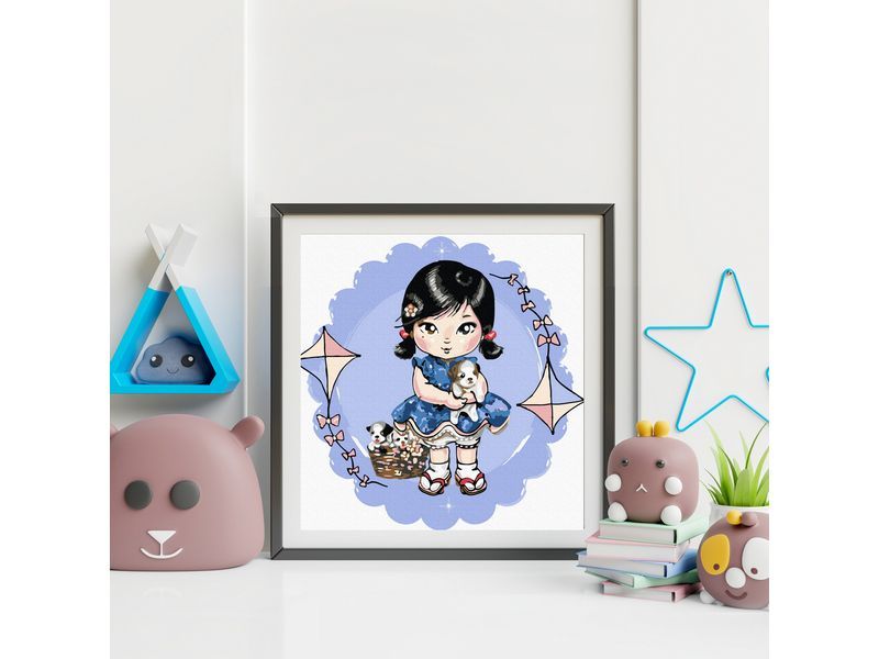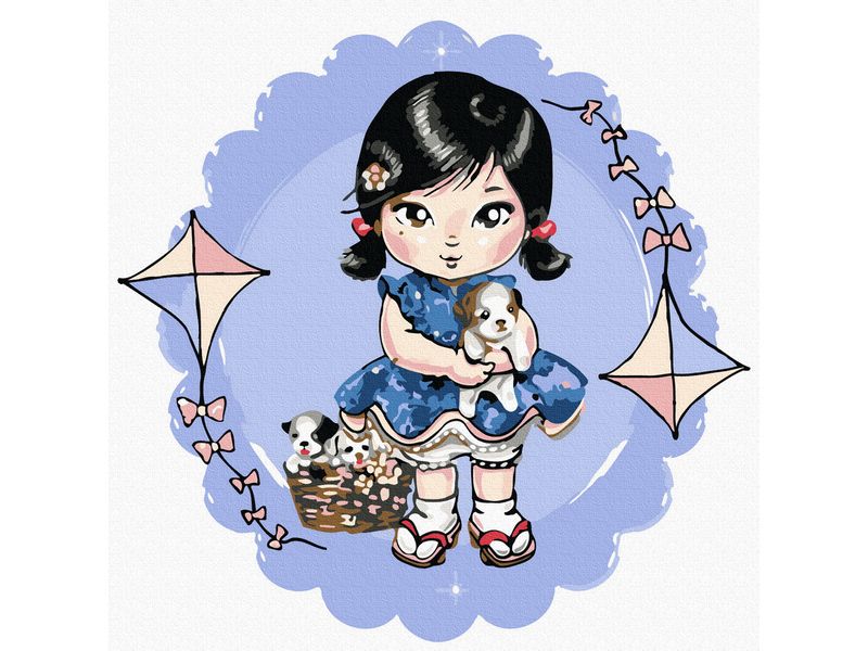 Используя кисти и краски, на холсте можно нарисовать девочку в голубом платье со щенками. Для такого творчества не требуются специальные художественные навыки. Нужно лишь следовать инструкции и время от времени сверяться с цветовой схемой рисунка.