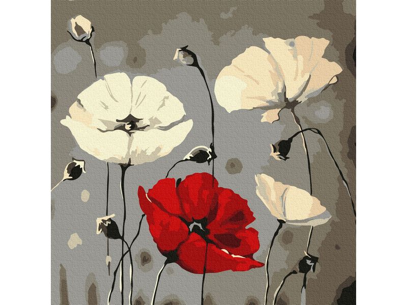 Используя кисти и краски, на холсте можно нарисовать всем знакомые цветы - маки. Основной фон и часть цветов выполнены в серо-белой гамме, тогда как основным акцентом картины является цветок красного цвета, расположенный по центру изображения. Для такого творчества не требуются специальные художественные навыки. Нужно лишь следовать инструкции и время от времени сверяться с цветовой схемой рисунка.