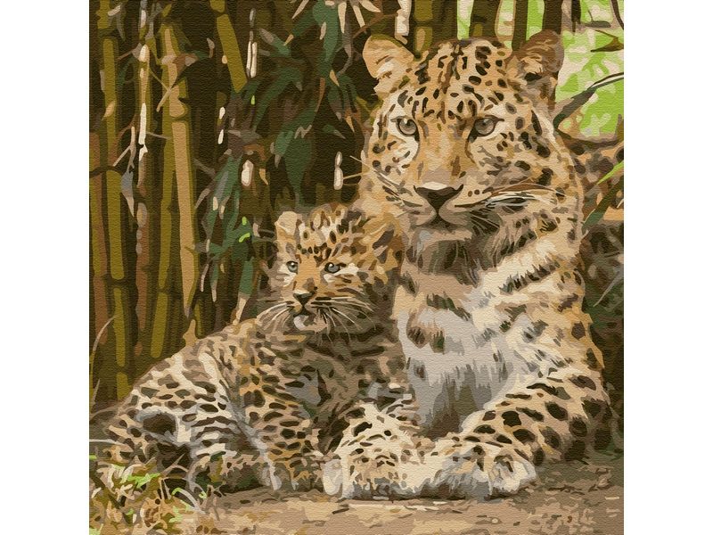 Используя кисти и краски, на холсте можно нарисовать картину с портретом взрослого тигра и маленького тигренка на фоне бамбуковых стеблей. Для такого творчества не требуются специальные художественные навыки. Нужно лишь следовать инструкции и время от времени сверяться с цветовой схемой рисунка.