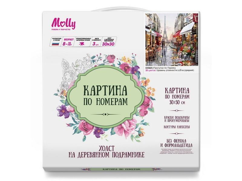 Используя кисти и краски, на холсте можно нарисовать картину "Прогулки по Парижу" - уютную парижскую улицу, утопающую в цветах. Недавно прошел дождь, по улицам прогуливаются влюбленные парочки. На заднем фоне виднеется Эйфелева башня. Для такого творчества не требуются специальные художественные навыки. Нужно лишь следовать инструкции и время от времени сверяться с цветовой схемой рисунка.
