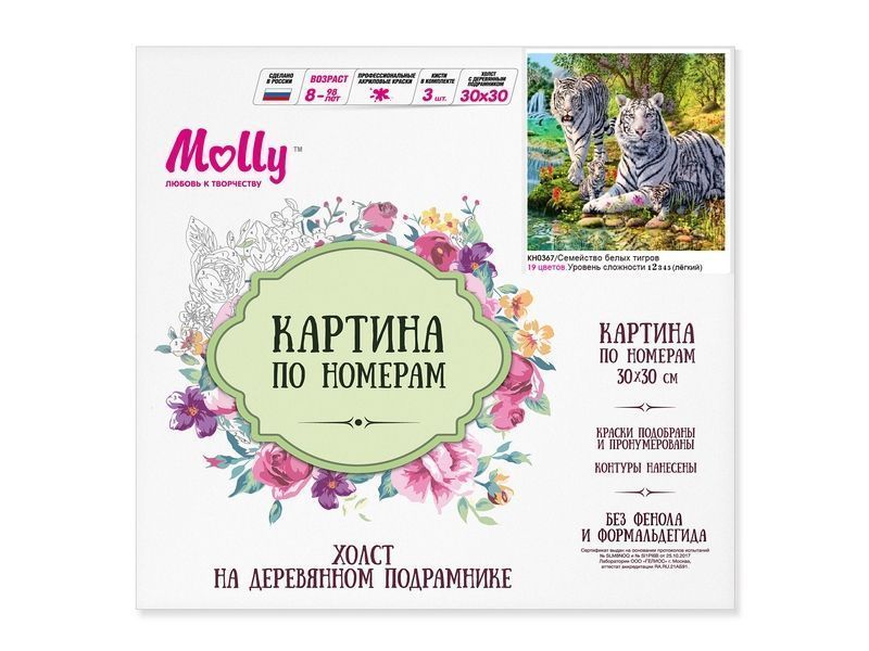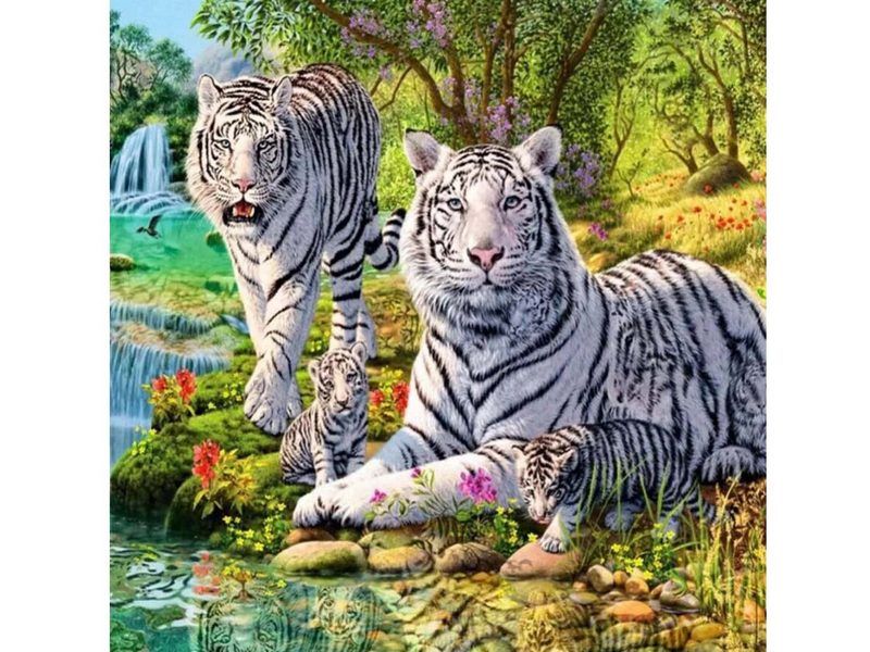 Используя кисти и краски, на холсте можно нарисовать семейство белых тигров, сидящих на живописном берегу. Для такого творчества не требуются специальные художественные навыки. Нужно лишь следовать инструкции и время от времени сверяться с цветовой схемой рисунка.
