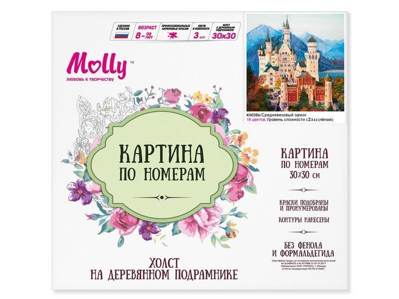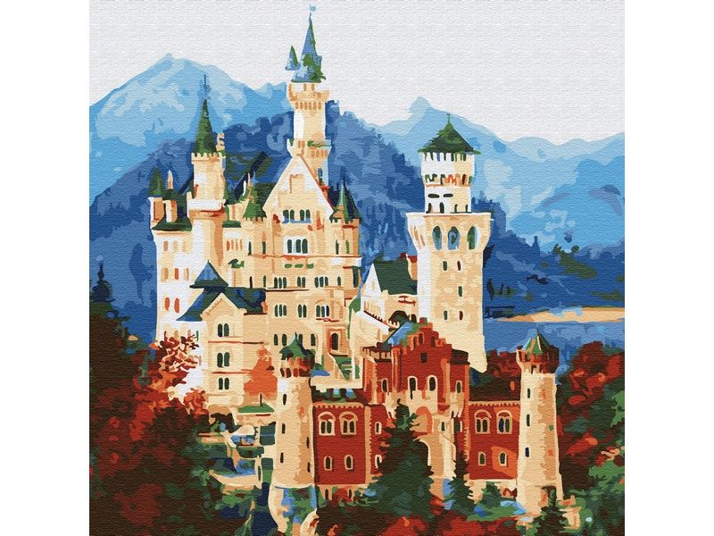 Используя кисти и краски, на холсте можно нарисовать картину с изображением Средневекового замка на фоне живописных гор и моря. Для такого творчества не требуются специальные художественные навыки. Нужно лишь следовать инструкции и время от времени сверяться с цветовой схемой рисунка.