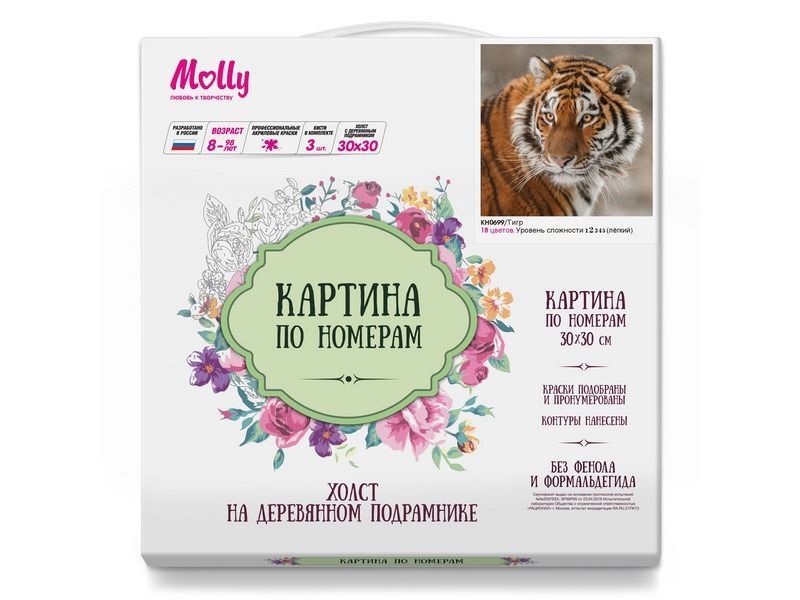 Используя кисти и краски, на холсте можно нарисовать картину "Тигр" - портрет тигра, задумчиво смотрящего вдаль. Для такого творчества не требуются специальные художественные навыки. Нужно лишь следовать инструкции и время от времени сверяться с цветовой схемой рисунка.