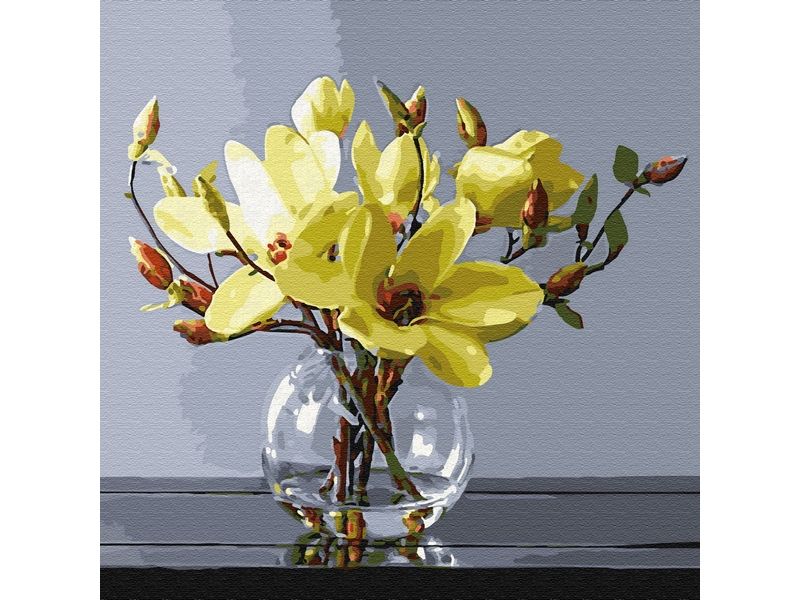 Используя кисти и краски, на холсте можно нарисовать букет желтых магнолий в стеклянной вазе. Для такого творчества не требуются специальные художественные навыки. Нужно лишь следовать инструкции и время от времени сверяться с цветовой схемой рисунка.