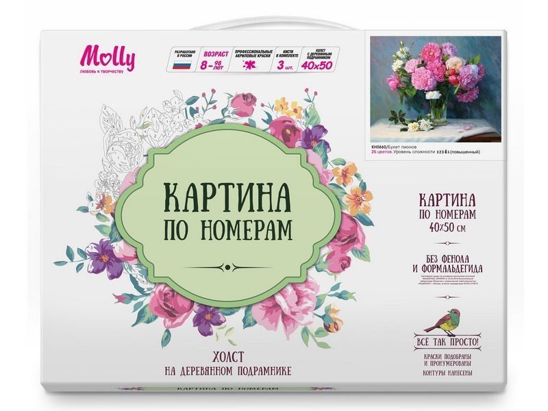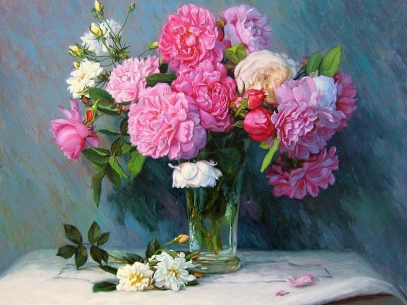 Используя кисти и краски, на холсте можно нарисовать букет пышных пионов. Для такого творчества не требуются специальные художественные навыки. Нужно лишь следовать инструкции и время от времени сверяться с цветовой схемой рисунка.