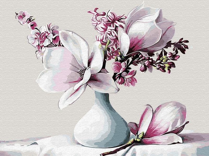 Используя кисти и краски, на холсте можно нарисовать нежный букет с магнолией. Белая ваза и нежнейшая скатерть на столе хорошо сочетаются друг с другом и создают идеальный фон. Для такого творчества не требуются специальные художественные навыки. Нужно лишь следовать инструкции и время от времени сверяться с цветовой схемой рисунка.