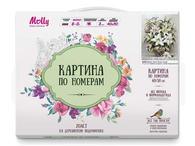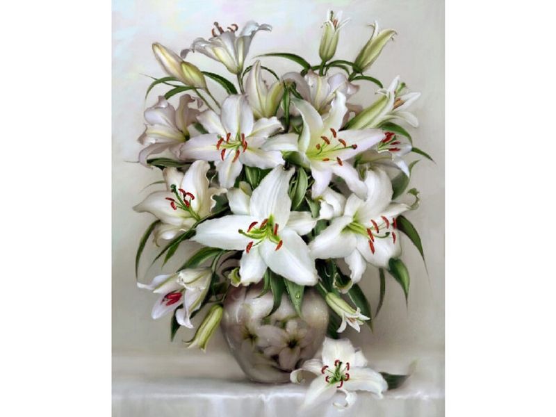 Используя кисти и краски, на холсте можно нарисовать картину Игоря Бузина "Букет белых лилий" с нежными, белыми лилиями в вазе. Для такого творчества не требуются специальные художественные навыки. Нужно лишь следовать инструкции и время от времени сверяться с цветовой схемой рисунка.