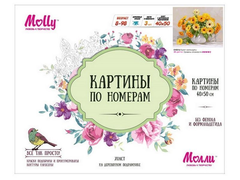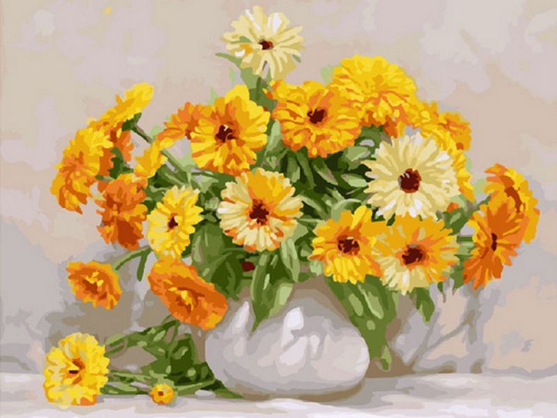 Используя кисти и краски, на холсте можно нарисовать картину Игоря Бузина "Букет календулы" - ярко-жёлтый букет календулы в белой вазе. Для такого творчества не требуются специальные художественные навыки. Нужно лишь следовать инструкции и время от времени сверяться с цветовой схемой рисунка.