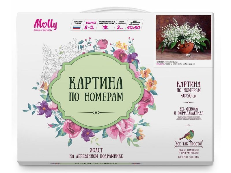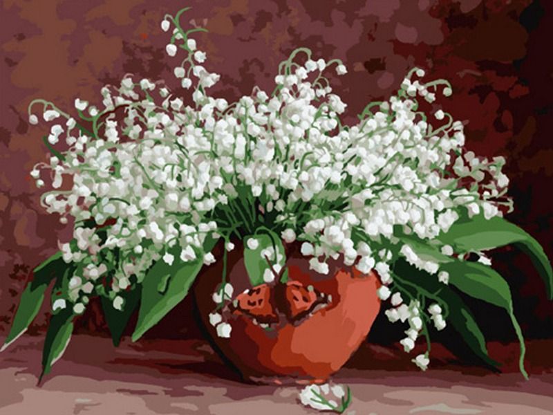 Используя кисти и краски, на холсте можно нарисовать картину Игоря Бузина "Ландыши" - букет весенних ландышей в вазе. Для такого творчества не требуются специальные художественные навыки. Нужно лишь следовать инструкции и время от времени сверяться с цветовой схемой рисунка.