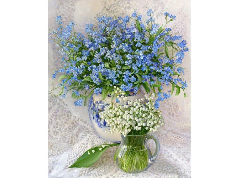 Используя кисти и краски, на холсте можно нарисовать картину Игоря Бузина "Незабудки с ландышами". Незабудки в вазе гжель и ландыши в прозрачной вазе создают неповторимо нежный ансамбль с кружевным фоном картины. Для такого творчества не требуются специальные художественные навыки. Нужно лишь следовать инструкции и время от времени сверяться с цветовой схемой рисунка.