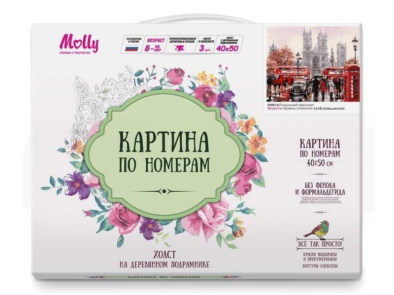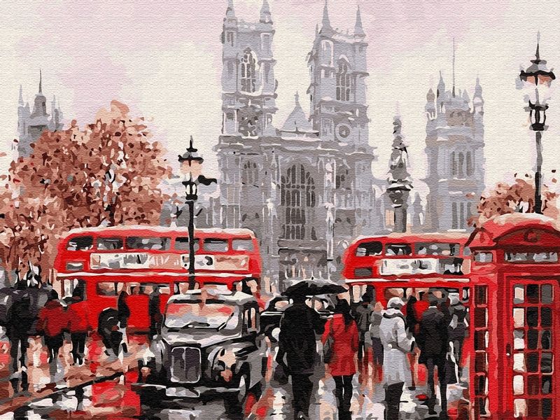 Используя кисти и краски, на холсте можно нарисовать городской пейзаж с известными атрибутами Лондона: знаменитый красный двухэтажный автобус, английские фонари и телефонная будка. Особый шарм картине придает использование 3-4 основных цветов (белого, черного, красного и серого) и их оттенков. Для такого творчества не требуются специальные художественные навыки. Нужно лишь следовать инструкции и время от времени сверяться с цветовой схемой рисунка.