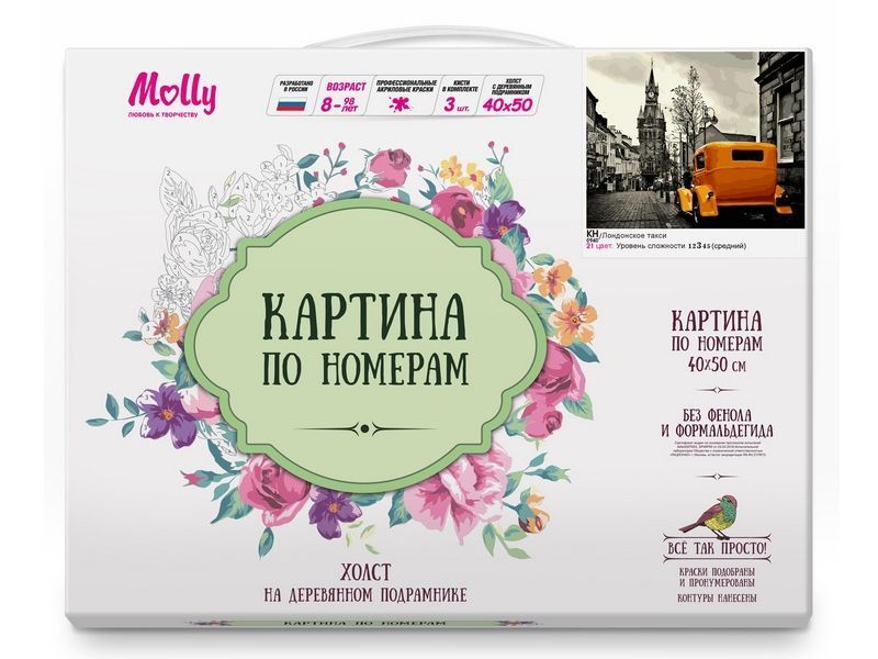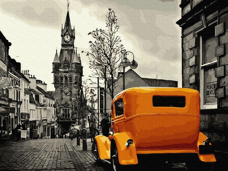Используя кисти и краски, на холсте можно нарисовать монохромную картину, с изображением улицы Лондона. Мостовая, фонари, деревья и здания выполнены в оттенках серого. Такси ярко-жёлтого цвета выступает в роли акцента, привлекающего взор зрителя. Для такого творчества не требуются специальные художественные навыки. Нужно лишь следовать инструкции и время от времени сверяться с цветовой схемой рисунка.