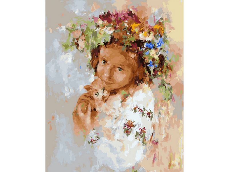 Используя кисти и краски, на холсте можно нарисовать ;девочку в белом платье с венком из цветов в волосах. В руках она держит маленького котенка. Девочка бережно прижимает котенка к себе. Для такого творчества не требуются специальные художественные навыки. Нужно лишь следовать инструкции и время от времени сверяться с цветовой схемой рисунка.