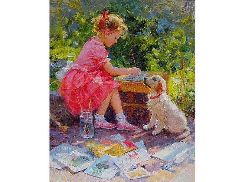 Используя кисти и краски, на холсте можно нарисовать картину "Маленькая художница". Рисование способно надолго увлечь даже самого подвижного ребенка. Вот и юная художница в ярком платье, взяв в руки кисть, создала уже не один рисунок. Рядом с девочкой сидит любимый щенок и внимательно наблюдает за хозяйкой. Для такого творчества не требуются специальные художественные навыки. Нужно лишь следовать инструкции и время от времени сверяться с цветовой схемой рисунка.