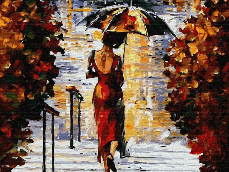 Используя кисти и краски, на холсте можно нарисовать картину Леонида Афремова "На ступеньках" - прекрасную незнакомку в вечернем платье, спускающуюся по лестнице, скрываясь от дождя под зонтом. Для такого творчества не требуются специальные художественные навыки. Нужно лишь следовать инструкции и время от времени сверяться с цветовой схемой рисунка.