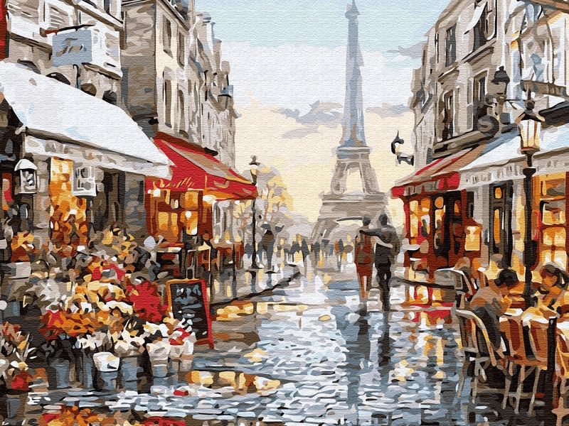 Используя кисти и краски, на холсте можно нарисовать город влюбленных - Париж. На заднем фоне виднеется Эйфелева башня. По улице прогуливаются романтичная парочка. Открыты двери цветочного магазина, приглашая влюбленных зайти. В уютных кафе сидят уставшие путники. Для такого творчества не требуются специальные художественные навыки. Нужно лишь следовать инструкции и время от времени сверяться с цветовой схемой рисунка.