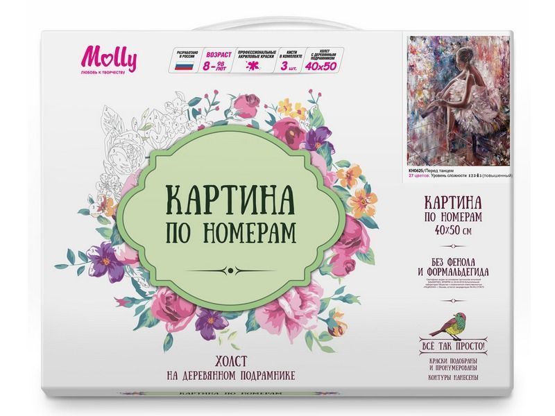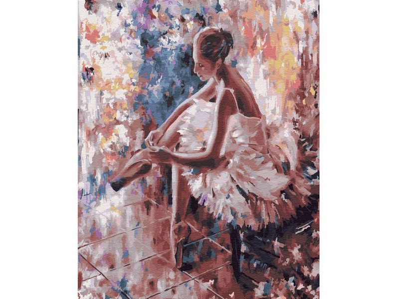 Используя кисти и краски, на холсте можно нарисовать запечатленный художником момент, когда балерина, готовясь к выступлению, надевает пуанты. Для такого творчества не требуются специальные художественные навыки. Нужно лишь следовать инструкции и время от времени сверяться с цветовой схемой рисунка.