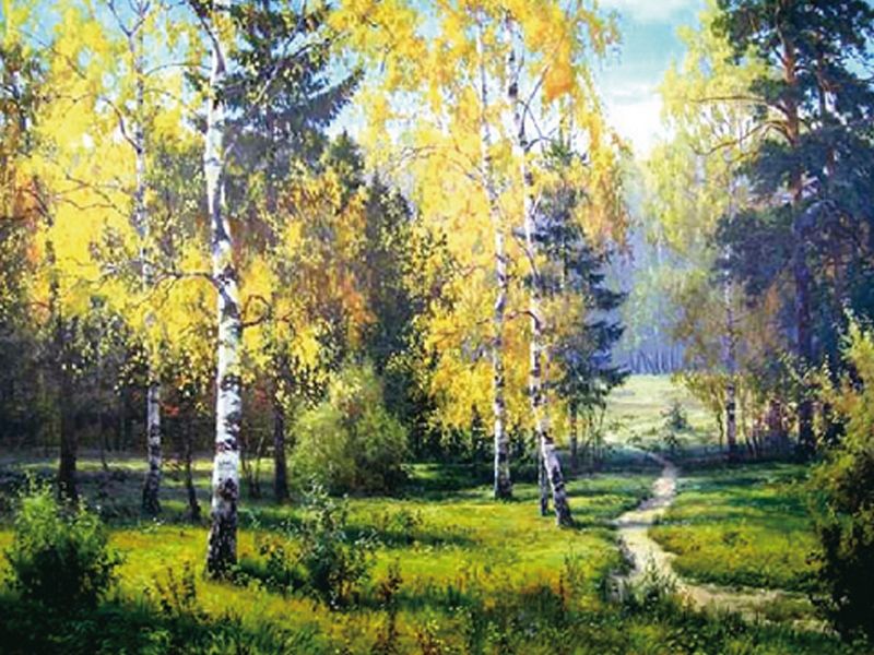 Используя кисти и краски, на холсте можно воссоздать картину русского художника Игоря Прищепы с березовой рощей. Осень уже вступает в свои права, и часть деревьев сменили цвет на желтый. Сквозь листву пробиваются лучи солнца. Для такого творчества не требуются специальные художественные навыки. Нужно лишь следовать инструкции и время от времени сверяться с цветовой схемой рисунка.