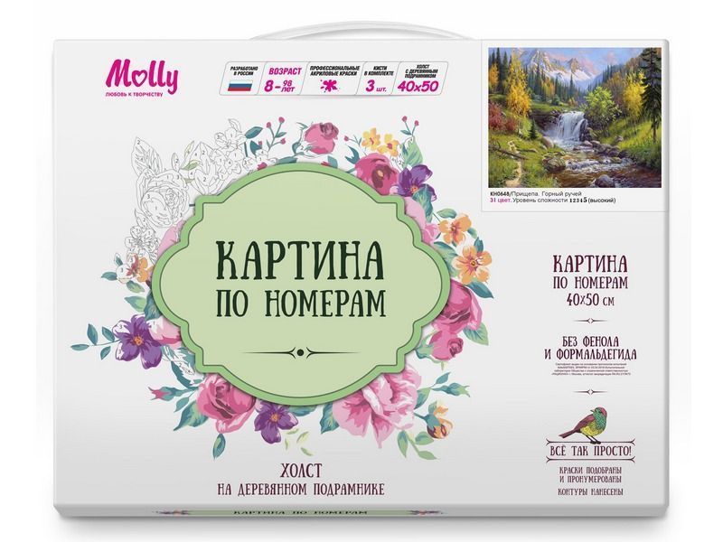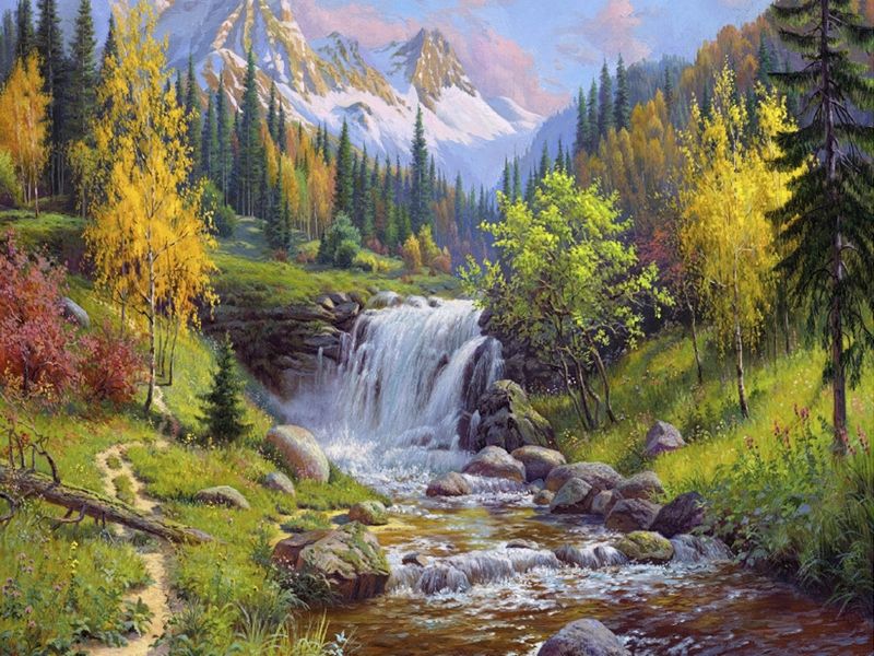 Используя кисти и краски, на холсте можно нарисовать картину русского художника Игоря Прищепы "Горный ручей". Ручей с шумом падает с уступа. По краям ручья растут деревья, окрашенные в яркие цвета осени. На заднем фоне виднеются горные вершины, укрытые снегом. Для такого творчества не требуются специальные художественные навыки. Нужно лишь следовать инструкции и время от времени сверяться с цветовой схемой рисунка.