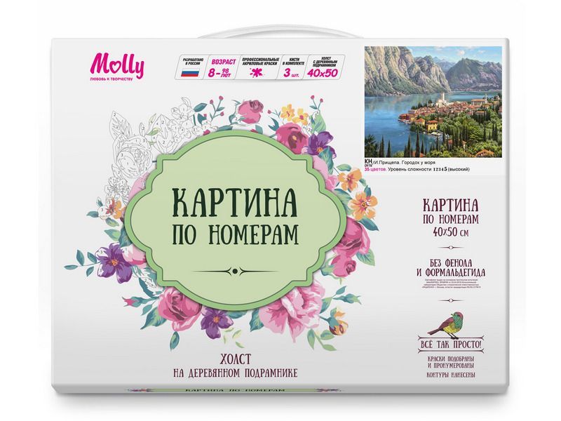 Используя кисти и краски, на холсте можно нарисовать картину русского художника Игоря Прищепы - городок на берегу моря в окружении величественных гор и живописной зелени. Для такого творчества не требуются специальные художественные навыки. Нужно лишь следовать инструкции и время от времени сверяться с цветовой схемой рисунка.