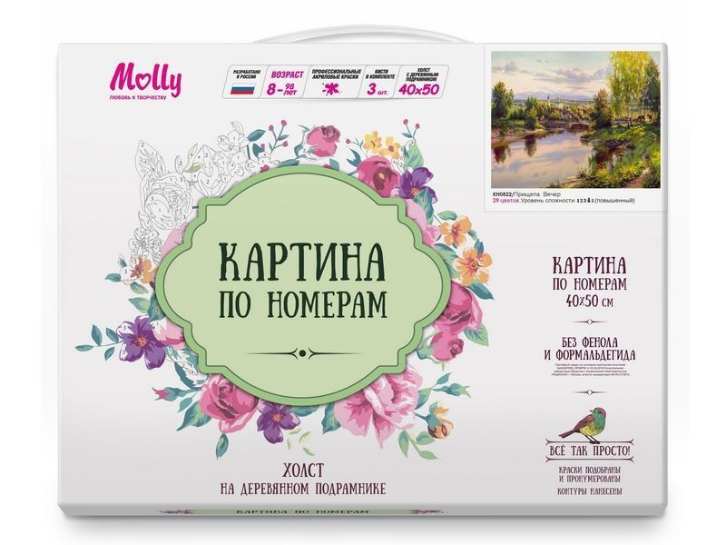 Используя кисти и краски, на холсте можно нарисовать картину русского художника Игоря Прищепы "Вечер". На картине запечатлен теплый, осенний вечер. У берега причалила лодка, где-то вдали, на поляне пасутся лошади, на заднем плане виднеется мост через реку и золотые купола церкви. Для такого творчества не требуются специальные художественные навыки. Нужно лишь следовать инструкции и время от времени сверяться с цветовой схемой рисунка.