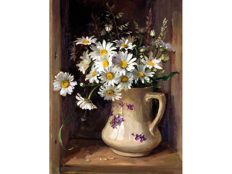 Используя кисти и краски, на холсте можно нарисовать летний букет белых ромашек в вазе. Для такого творчества не требуются специальные художественные навыки. Нужно лишь следовать инструкции и время от времени сверяться с цветовой схемой рисунка.