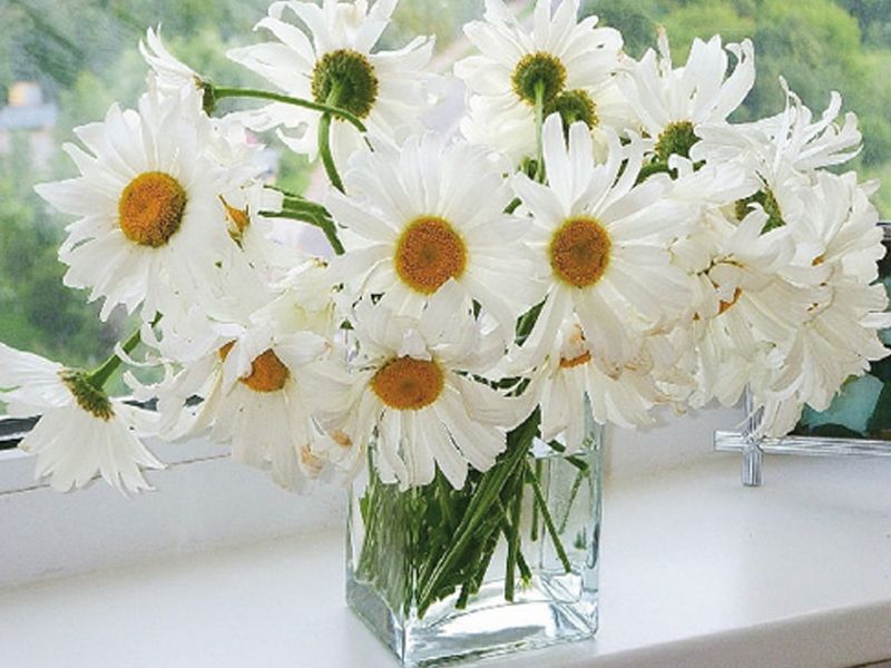 Используя кисти и краски, на холсте можно нарисовать букет нежных ромашек в вазе на окне. Для такого творчества не требуются специальные художественные навыки. Нужно лишь следовать инструкции и время от времени сверяться с цветовой схемой рисунка.