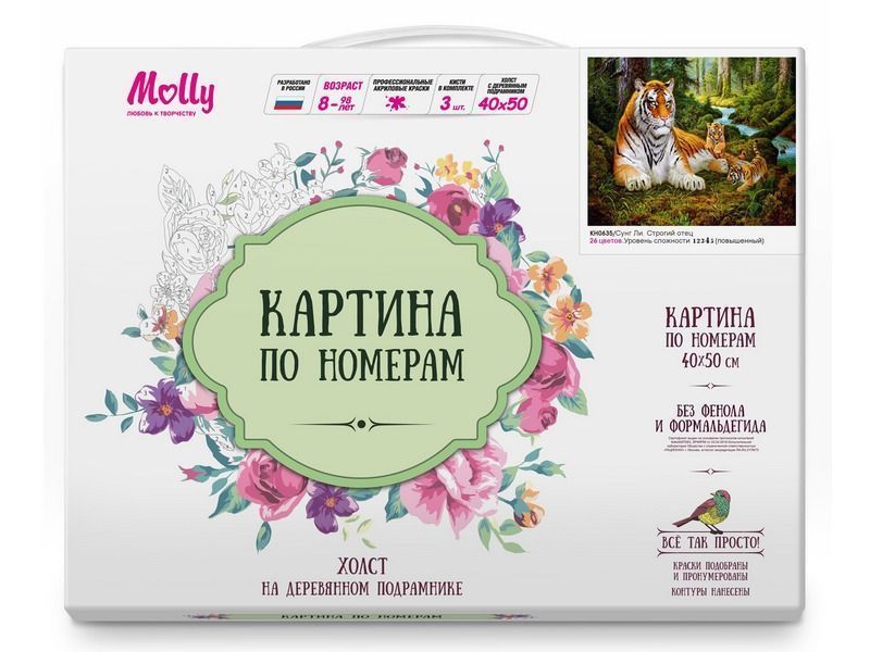 Используя кисти и краски, на холсте можно нарисовать картину известного корейского художника Сунг Ли "Строгий отец", на которой изображен тигр-отец и рядом два резвящихся тигренка. Для такого творчества не требуются специальные художественные навыки. Нужно лишь следовать инструкции и время от времени сверяться с цветовой схемой рисунка.