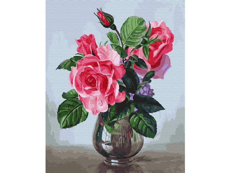Используя кисти и краски, на холсте можно нарисовать букет розовых роз в вазе на голубом фоне. Для такого творчества не требуются специальные художественные навыки. Нужно лишь следовать инструкции и время от времени сверяться с цветовой схемой рисунка.