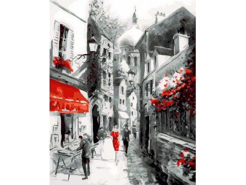Используя кисти и краски, на холсте можно нарисовать городской пейзаж, где запечатлена часть узкой улицы. Особенно интересно цветовое решение картины: белый и оттенки серого - это основные цвета при создании картины. Для такого творчества не требуются специальные художественные навыки. Нужно лишь следовать инструкции и время от времени сверяться с цветовой схемой рисунка.